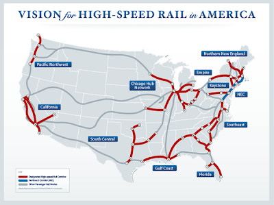 The $8 billion in the Recovery Act for high-speed rail was step one, a down payment on a national network that, within 25 years, will give 80% of Americans the choice of traveling from downtown to downtown by high speed passenger train. With today's awards, we take a second step toward that future. A future that envisions riding from downtown Los Angeles to downtown San Francisco in two hours and forty minutes. Or Chicago to St. Louis in two hours. Or Tampa to Orlando in 55 minutes.
